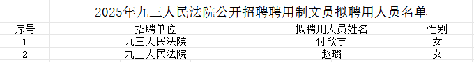 按照《九三人民法院招聘聘用制文员工作实施方案》要求,经过公开报名、资格审查、笔试、面试、体检、考察等程序,拟聘用以下两名同志为九三人民法院聘用制文员,现予以公示: