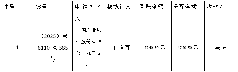 本院在执行(2025)黑8110执385号案件过程中,根据《最高人民法院关于执行款物管理工作的规定》,拟向下列案外人发放案款(详见附表《拟发放案款清单》),为充分保护债权人权益,现予以公示,公示期为七天。公示期间,案件当事人或其他利害关系人主张权利的,应向本院提出书面异议并附相关证据材料(联系地址:嫩江市九三管理局九三路9号;联系人:宋玉鹏;联系电话:0456-7881104),本院依法审查处理。公示期满无异议的,本院将按照相关程序办理案款发放手续。