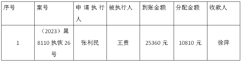 本院在执行(2023)黑8110执恢26号案件过程中,根据《最高人民法院关于执行款物管理工作的规定》,拟向下列案外人发放案款(详见附表《拟发放案款清单》),为充分保护债权人权益,现予以公示,公示期为七天。公示期间,案件当事人或其他利害关系人主张权利的,应向本院提出书面异议并附相关证据材料(联系地址齐齐哈尔市龙沙区民航路17号;联系人李景春;联系电话:0452-2891979),本院依法审查处理。公示期满无异议的,本院将按照相关程序办理案款发放手续。