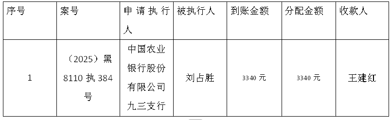 本院在执行(2025)黑8110执384号案件过程中,根据《最高人民法院关于执行款物管理工作的规定》,拟向下列案外人发放案款(详见附表《拟发放案款清单》),为充分保护债权人权益,现予以公示,公示期为七天。公示期间,案件当事人或其他利害关系人主张权利的,应向本院提出书面异议并附相关证据材料(联系地址:嫩江市九三管理局九三路9号;联系人:刘翀宇;联系电话:0456-7881104),本院依法审查处理。公示期满无异议的,本院将按照相关程序办理案款发放手续。